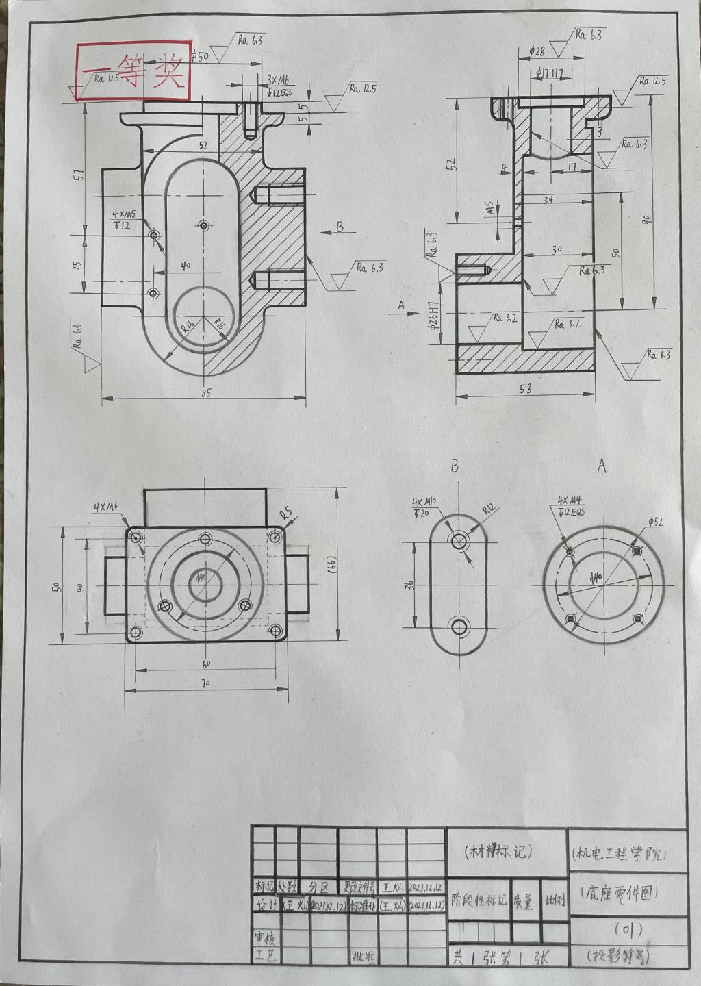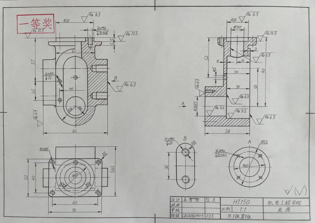 本次竞赛是我院首次举行机械制图手绘竞赛,2023新生踊跃报名参赛,全院2023级学生共提交260余副手绘机械图纸,经过层层选拔,评选出4名一等奖、9名二等奖、15名三等奖。根据竞赛规程,同学们的获奖等次可对应置换《机械制图》课程成绩。