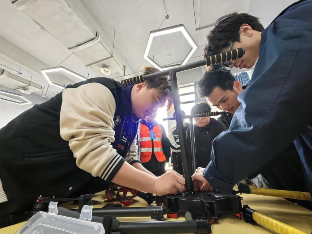 45名参与同学分组协作,完整体验无人机从零件到成品的组装全流程。活动现场,企业技术员与专业教师全程指导,解答学生在传感器校准、动力系统匹配中的技术难题。组装完成后,同学们在安全区域内试飞调试,并围绕飞行稳定性、航拍功能优化等展开热烈讨论。