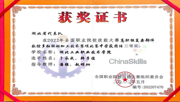 新闻网讯8月18日,由国家教育部、发展改革委、人社部等35部门联合主办的2022年“中银杯”全国职业院校技能大赛(高职组)复杂部件数控多轴联动加工技术赛项在四川工程职业技术学院举行,由pg游戏pg游戏电子模拟器潘强、赵明炯老师指导,韩子俊、卜永成参赛的团队荣获该赛项三等奖。