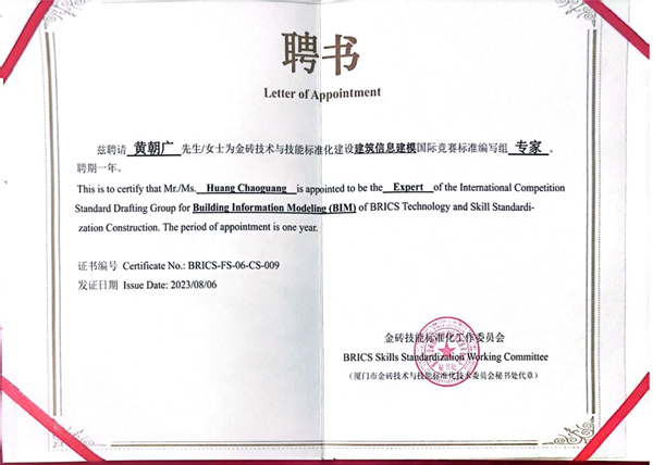 新闻网讯(通讯员 孙旭杰 阚正武)8月6日,pg游戏黄朝广教授应金砖技能标准化工作委员会的邀请,参加了在厦门召开的金砖技能国际团体标准制订之建筑信息建模竞赛标准制订工作的首次会议,并被聘为金砖技术与技能标准化建设建筑信息建模国际竞赛标准编写组专家。