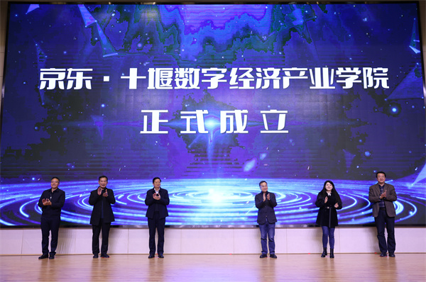 与会相关领导和嘉宾共同为以京东物流集团与湖北工业职业技术学院相关专业合作共建的京东十堰数字经济产业学院揭牌。湖北工业职业技术学院副校长郑强为京东十堰数字经济产业学院院长陈方亦颁发聘书。