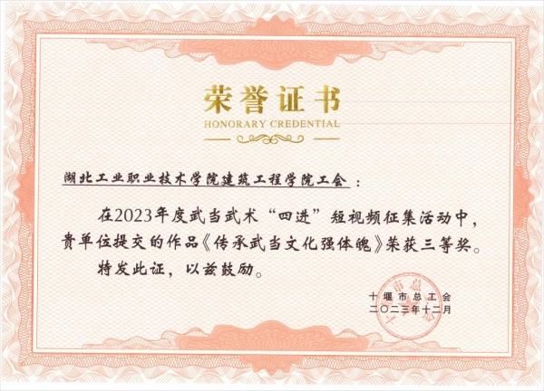 据悉,建筑工程学院自2010年以来,利用学校位于武当山下的区位优势,把传承传统文化和演练武当武术融入日常教学,每年坚持举办武当武术(太极拳)进校园活动,让来自全国各地的青年学子从大一进校开始,利用早晚自习、早锻炼时间,坚持训练武当十八式太极拳和武当九式太极拳,大一学期结束时进行比赛展演表彰,十三年来从未间断,至今已有4371名学生学会武当太极拳,其中,2012年600名建工学子成功参演武当大兴六百年开幕式大型太极拳表演。如今,武当太极拳成为建筑工程学院持续时间最长、最具生命力、最深受同学们欢迎的特色体育课程和体育运动项目。