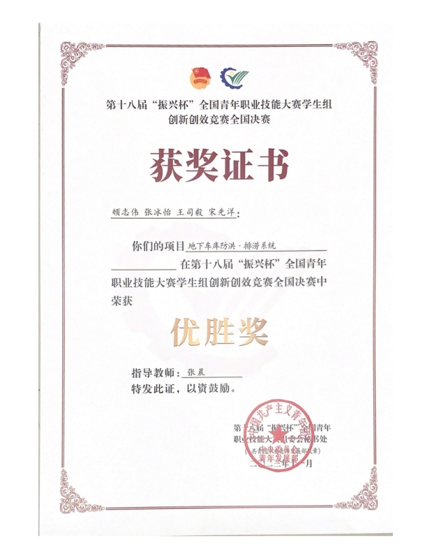 新闻网讯(通讯员 玉声)近日,从团省委传来喜讯,由张晨老师指导的pg游戏顿志伟等同学创新项目《地下车库防洪·排涝系统》在第十八届“振兴杯”全国青年职业技能大赛学生组创新创效竞赛全国决赛中荣获优胜奖。湖北省共28个项目获奖。