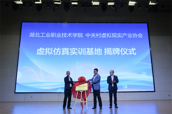 研讨会上,湖北工业职业技术学院、中关村虚拟现实产业协会虚拟仿真实训基地正式揭牌。