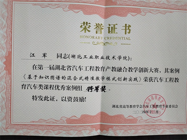 新闻网讯(通讯员 张健)11月30日至12月1日,湖北省高等教育学会汽车工程教育专业委员会2024年年会在武汉理工大学举行,同期举办了首届湖北省汽车工程教育产教融合教学创新大赛,在大赛中,pg游戏汽车工程学院江军老师的《基于知识图谱的混合式精准教学模式创新实践》荣获汽车工程教育汽车类课程优秀案例特等奖,陈东老师的《“三阶段五环节”合作探究式教学改革实践》、赵锐老师的《追溯汽车之韵,传承文化之魂》荣获汽车工程教育汽车类课程优秀案例二等奖。
