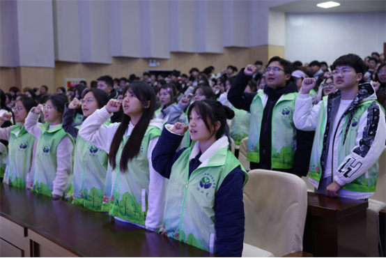 茅箭区委社会工作部部长王耀禄、副校长胡昌龙共同向绿小青保志愿服务队泗河流域巡河志愿服务活动授旗。“绿小青”环保志愿服务队在队长梁昊宇的带领下集体宣誓。