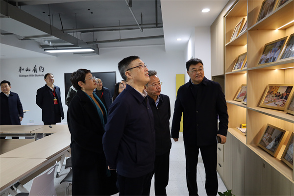 师永学一行深入校园,察看了匠心忆园、一站式学生社区综合服务中心、百草园心灵花园,考察了教育教学设施以及校园文化建设和学生服务管理等情况。校党委书记、校长边疆向师永学一行汇报了学校近年来办学发展情况。