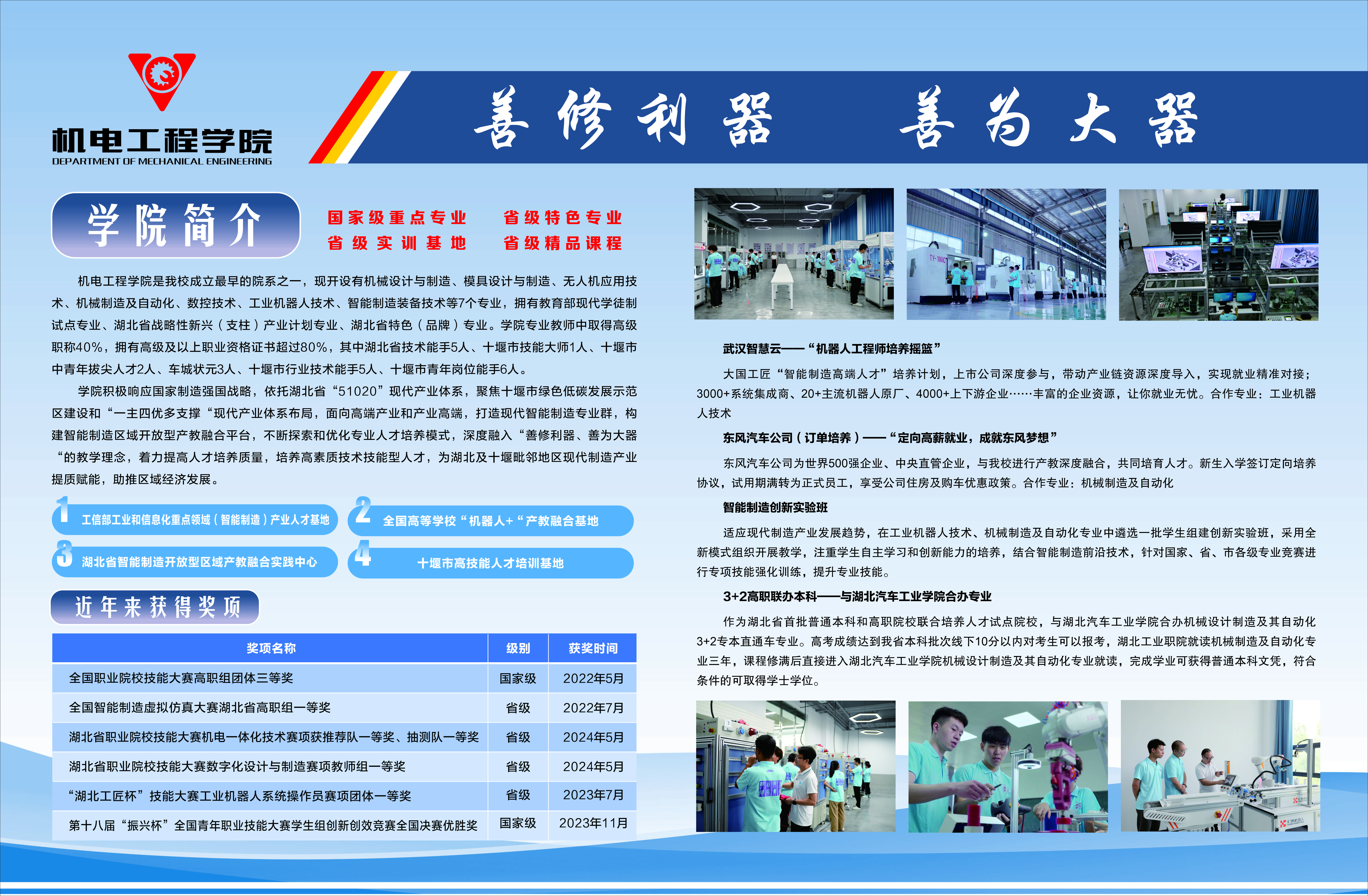 使命:培养德、智、体、美、劳全面发展的高素质技术技能型人才,助推十堰及湖北智能制造产业提档升级。